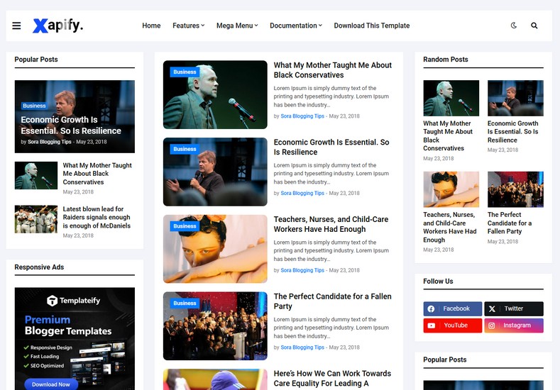Xapify Blogger Template is a modern, fast-loading, and SEO-friendly Blogger template designed for users who want to create a professional and high-performing website with ease. Built with a clean and minimal layout, this theme ensures that your content remains the main focus while still delivering a premium and engaging user experience across all devices, including mobile, tablet, and desktop. Its responsive design automatically adjusts to different screen sizes, making your website accessible and visually appealing to every visitor. Xapify is developed with proper SEO structure, optimized coding, and schema integration, which helps search engines understand your content better and improves your chances of ranking higher on Google. In addition to SEO benefits, the theme is optimized for speed, ensuring fast loading times that reduce bounce rates and increase user engagement. It also comes with a user-friendly interface, allowing easy customization without requiring technical knowledge, making it perfect for beginners as well as professionals. The theme includes clean navigation, well-structured sections, and widget-ready areas to showcase important content effectively, along with ad-friendly spaces for monetization opportunities like Google AdSense and affiliate marketing. With modern typography, balanced spacing, and social media integration, Xapify helps you build a strong online presence and connect with a wider audience. Whether you are creating a blog for finance, business, technology, or personal branding, this theme provides a solid foundation to grow your website, improve visibility, and build long-term credibility online. Seo Ready, Browser Compatibility, Responsive, Adapted From WordPress, Social Bookmark Ready, Post Thumbnails, Ads Ready, Drop Down Menu, White, Violet, Black, Green, Blue, Red, Fashion, Elegant, Simple, WhatsApp Sharing, Magazine, News, Breadcrumb Navigation Ready, Google, Blogger Layout Version 3.0, AMP, 3 Column, Mega Menu, Slideshow, Grid, No Footer.